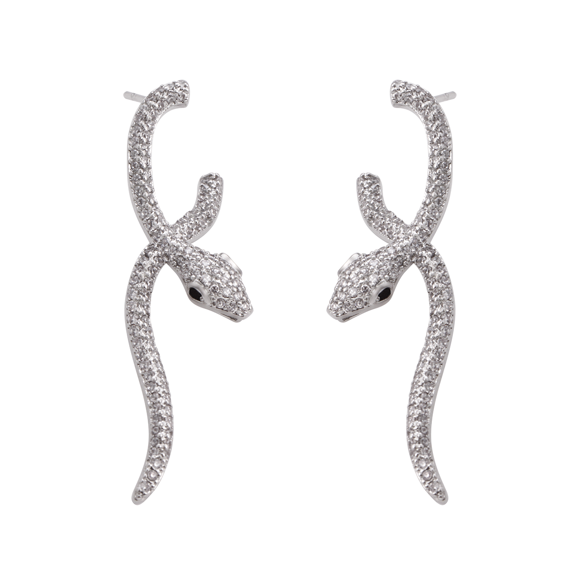 Arete con diseño de vibora fabricado en chapa de rodio con zirconias
