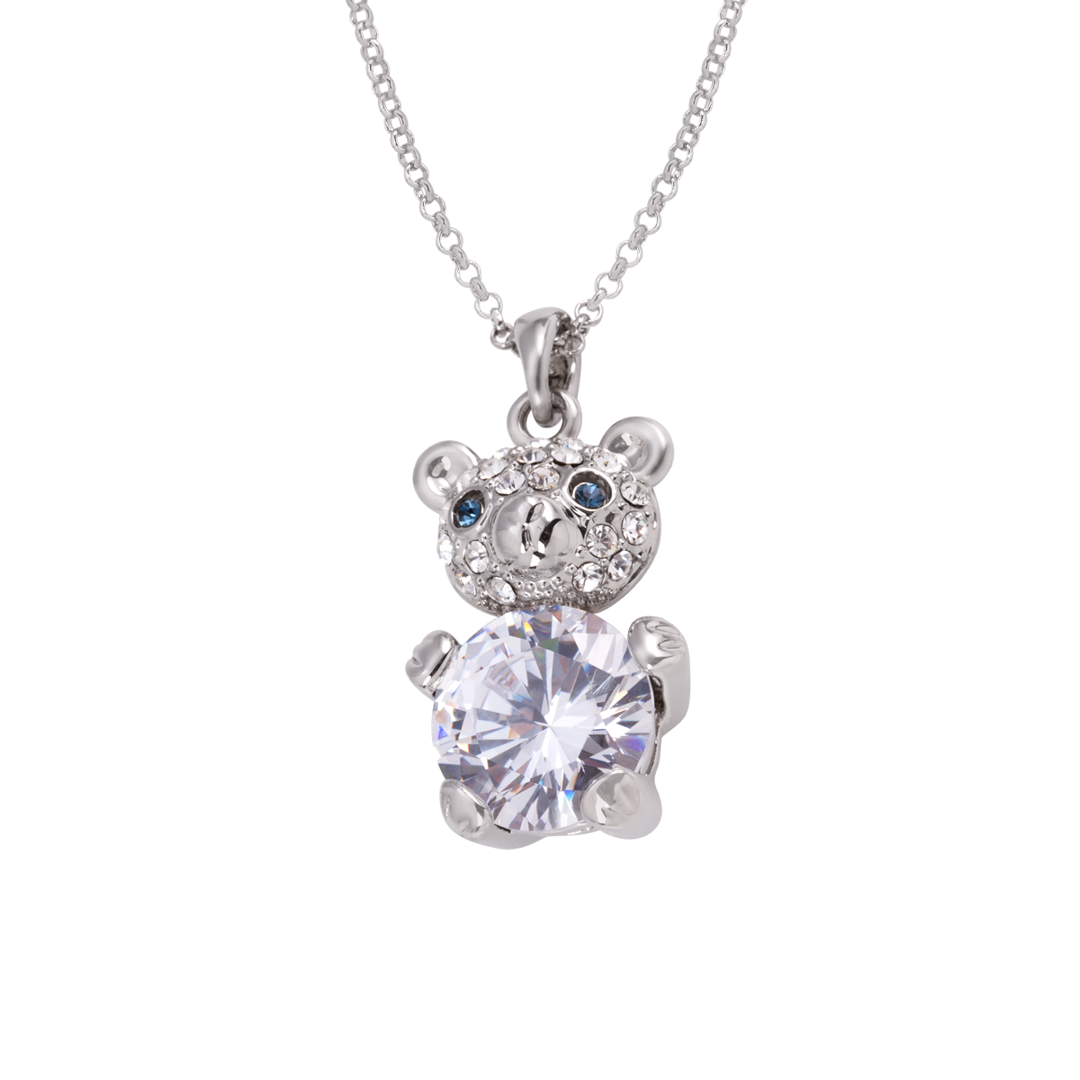 Collar en chapa de rodio con dije de oso e incrustación de zirconias. Largo de la cadena: 38 CM + 5 CM EXTENSION