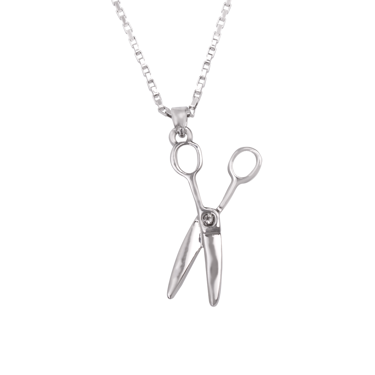 Disfruta de este hermoso collar en chapa de rodio con dije de tijeras y expresa tu creatividad para combinar tus atuendos.