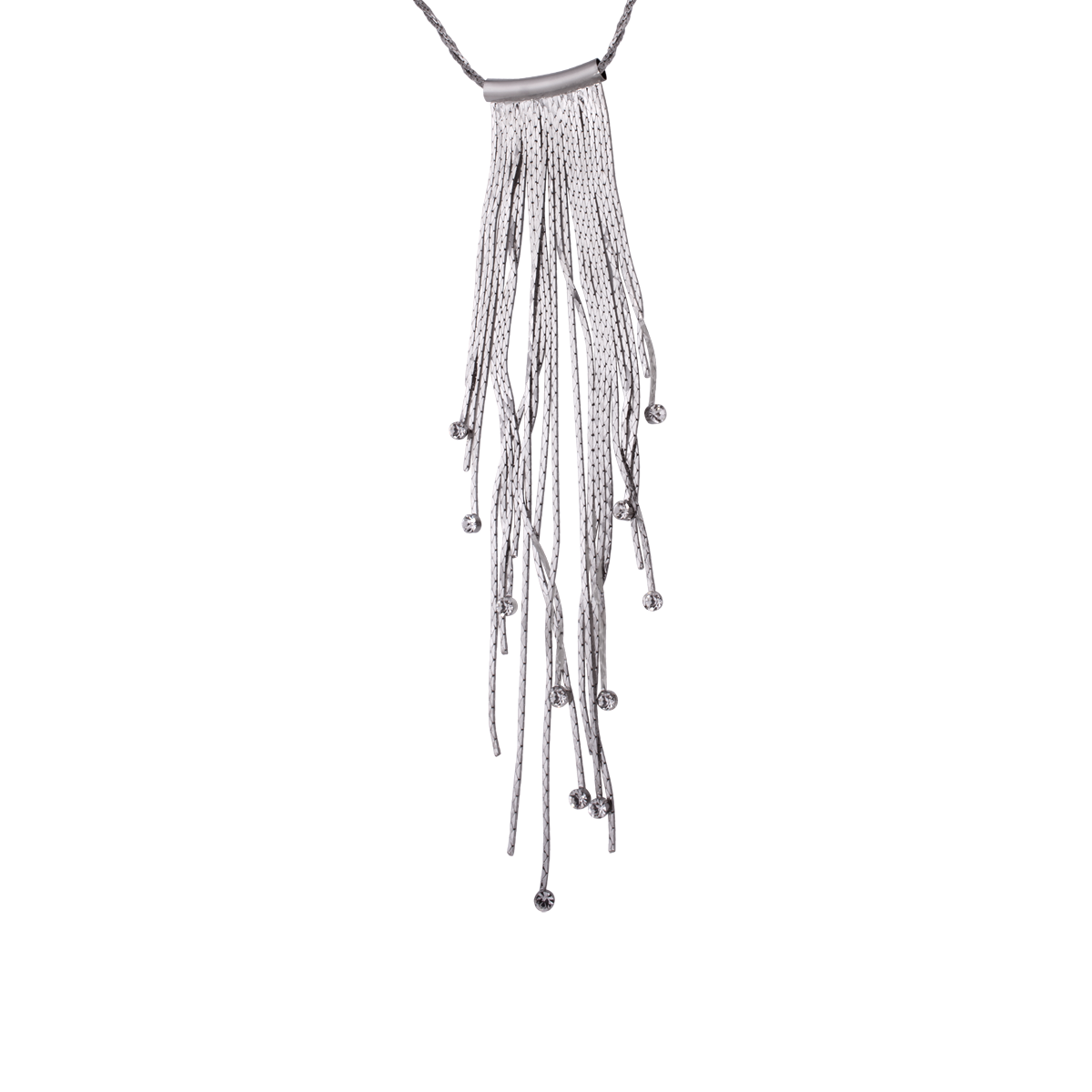 Collar en chapa de rodio con tiras colgantes. Largo de la cadena: 67 CM + 5 CM EXTENSION