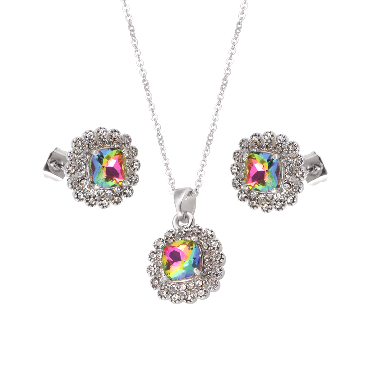 Juego para dama con piedra tornasol y zirconias fabricado en chapa de rodio