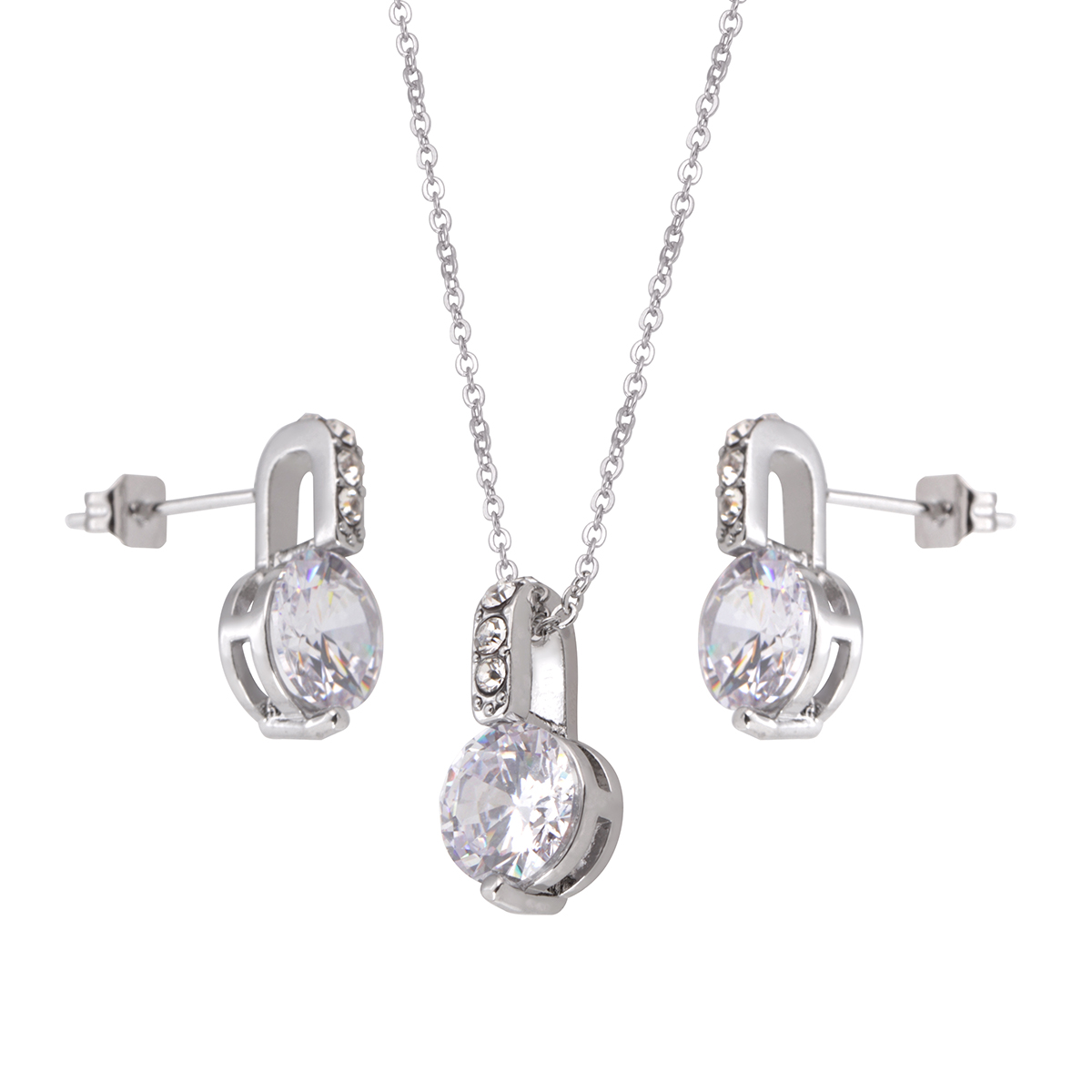 Juego para dama diseño de candado con zirconia fabricado en chapa de rodio, incluye par de aretes y collar
