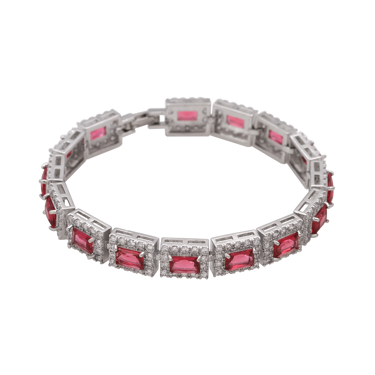 Pulsera con zirconia rosa rectangurlar y en su orilla zirconias blanca fabricado en chapa de rodio